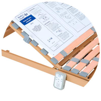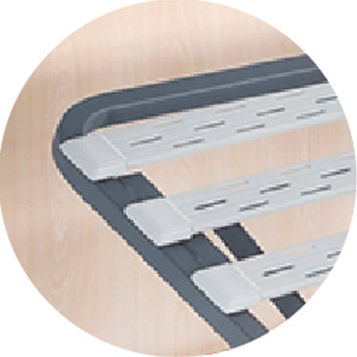 Lecho de 4 planos y 3 articulaciones. Lamas de haya vaporizada recubiertas de papel melamínico de 53x8mm, doble lama con tensores en zona lumbar. Tacos de sujeción de lamas fijos de polietileno.