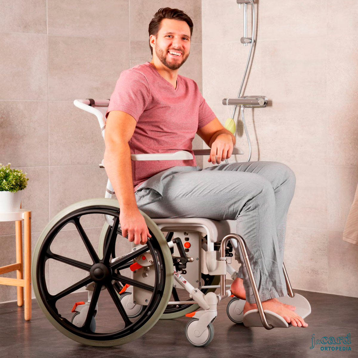 Versión MOBIL 2 para personas independientes. Las ruedas de 600mm permiten al usuario impulsar la silla obteniendo libertad de movimientos y mayor independencia durante la higiene personal.