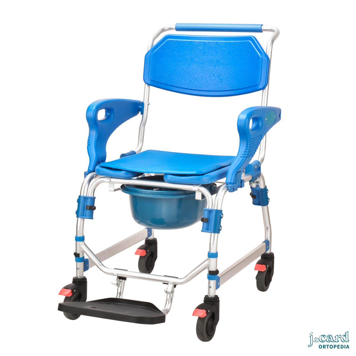 Silla de ducha y WC de aluminio, ligera y resistente. Con frenos en las cuatro ruedas, reposabrazos abatibles y asiento anatómico acolchado para una higiene cómoda, segura y práctica.