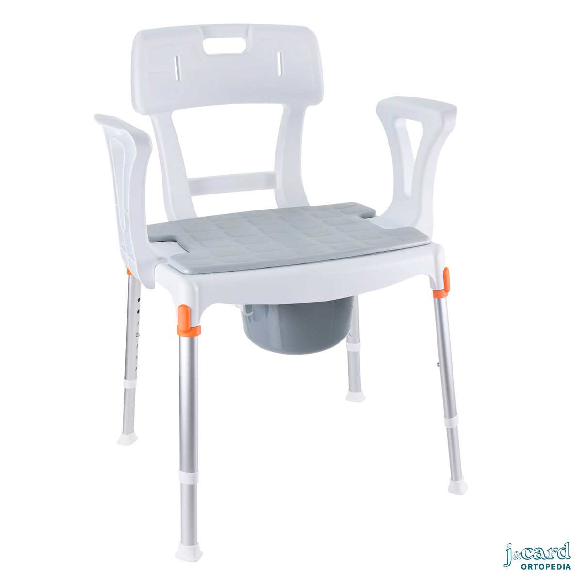 La silla con inodoro PORTOFINO es una práctica alternativa al inodoro convencional. Puede colocarse sobre el WC como elevador o usarse como silla de ducha al añadir la tapa blanda. Versátil y funcional, se monta fácilmente sin herramientas, adaptándose a distintas necesidades de movilidad y cuidado personal.