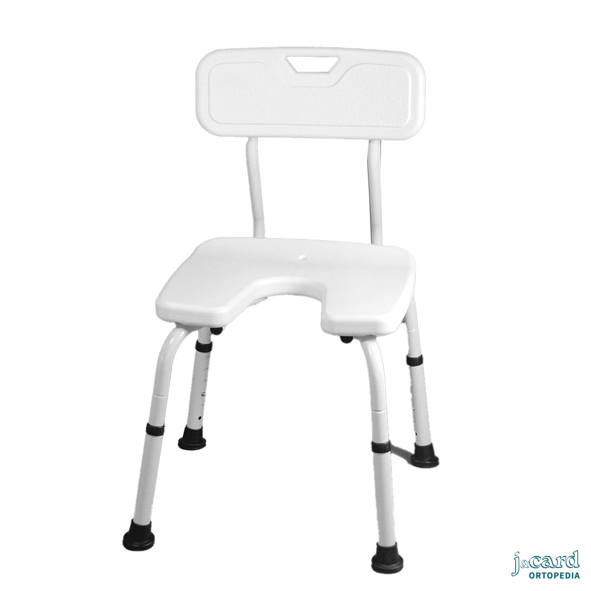 Silla de baño con respaldo de plástico y asiento en forma de herradura que facilita la higiene íntima. Diseñada para su uso en la ducha o el baño, cuenta con patas extensibles para ajustar la altura y conteras de caucho antideslizantes que aportan firmeza, seguridad y una gran estabilidad.