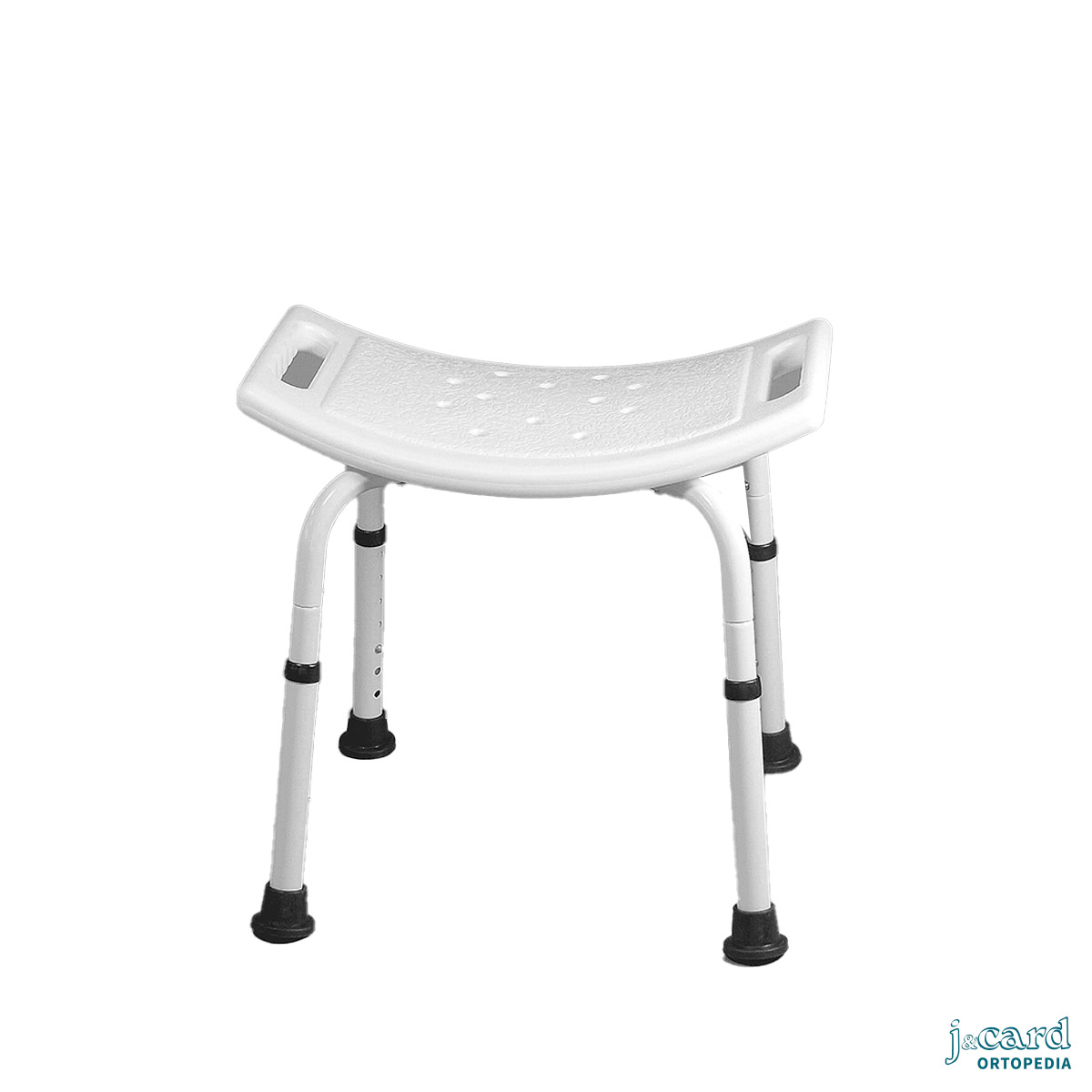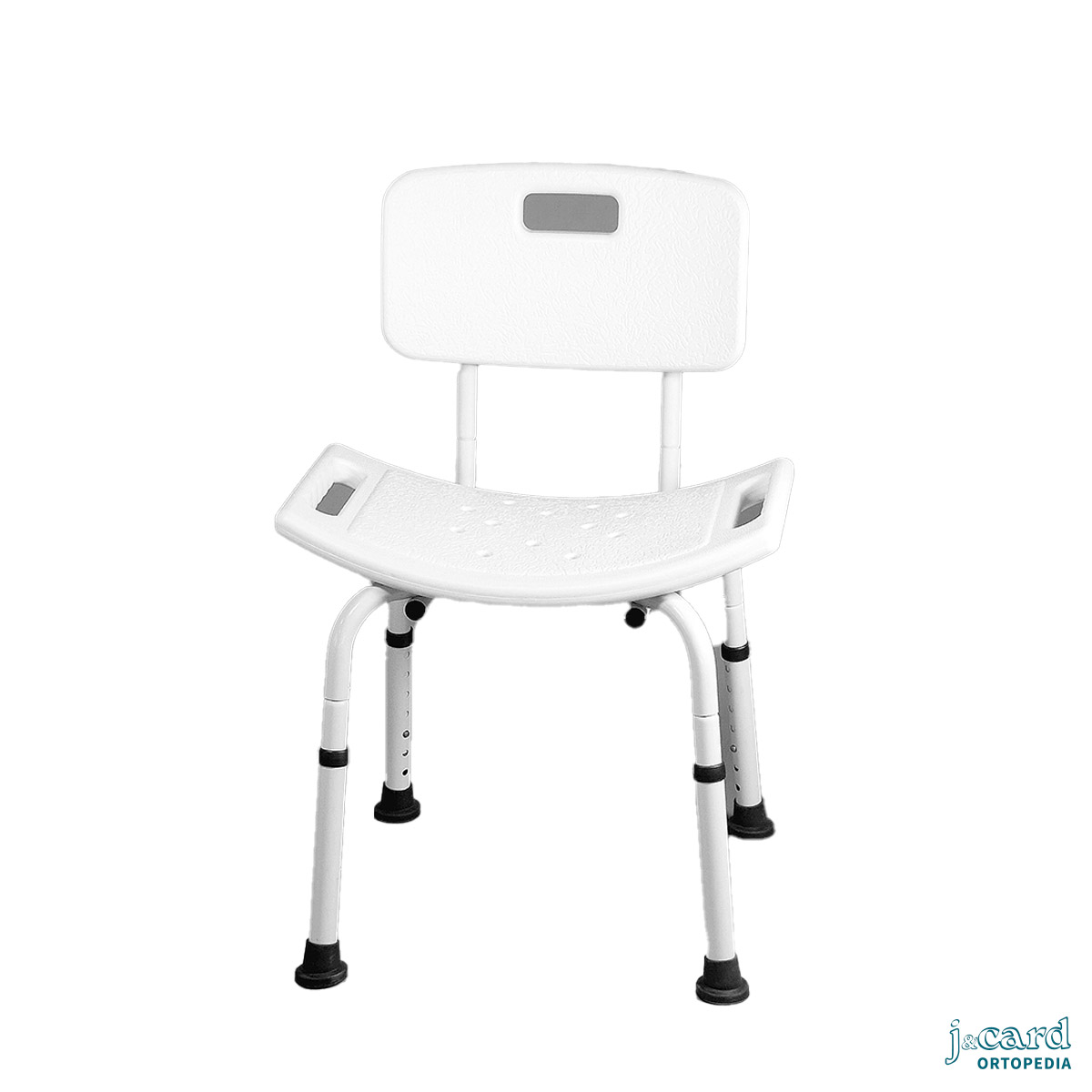 Silla de baño con respaldo de plástico, asiento con desagües y asideras integradas para mayor higiene y seguridad. Diseñada para su uso en la ducha o el baño, cuenta con patas extensibles que permiten ajustar la altura y conteras de caucho que garantizan una excelente estabilidad.