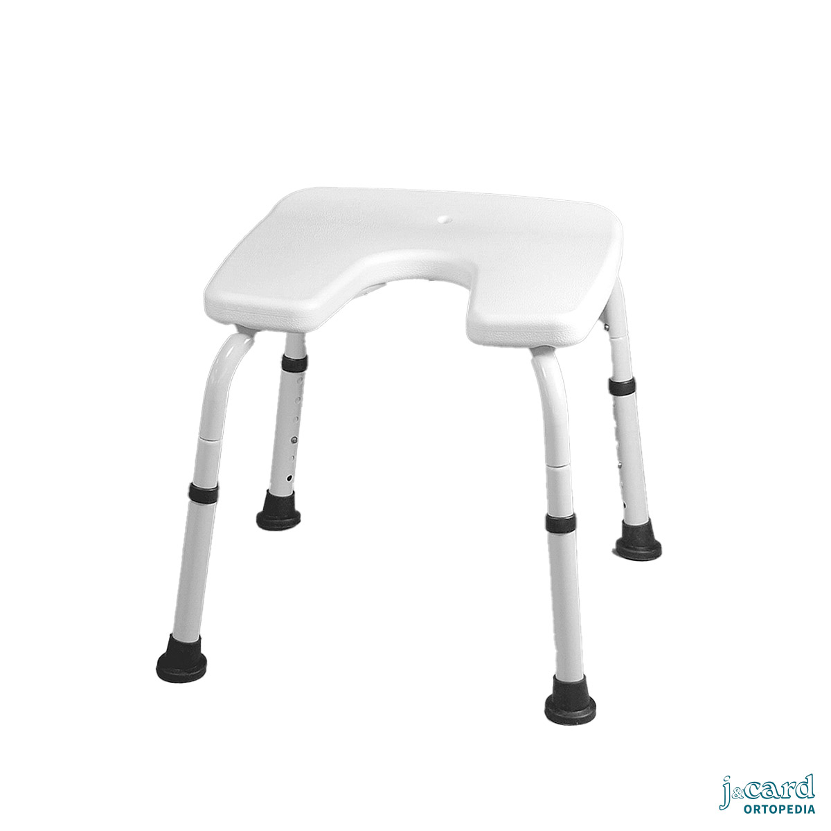 Taburete con asiento en forma de herradura que facilita la higiene íntima. Diseñado para su uso en la ducha o el baño, cuenta con patas extensibles que permiten ajustar la altura y conteras de caucho que proporcionan estabilidad, seguridad y comodidad durante el aseo diario.